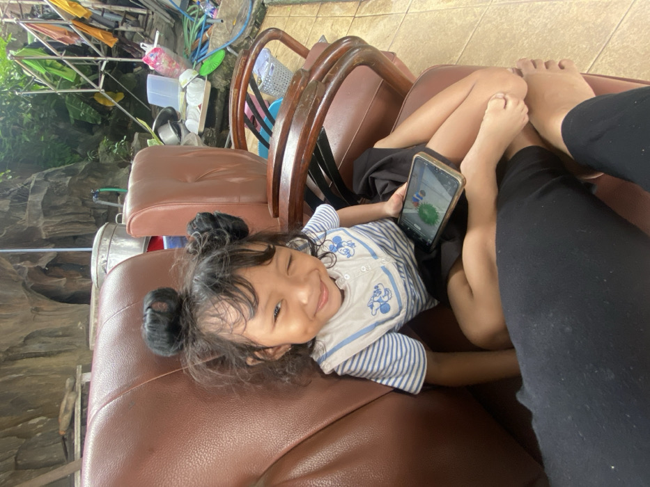 A young girl with two hair buns smiles while lying on a brown chair and holding a smartphone. She wears a blue and white striped shirt with cartoon character detailing. Another chair is visible in the background along with foliage and a tiled floor. A person in black pants is partly in the shot.