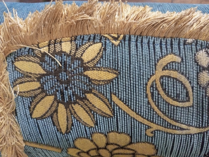 A close-up shows a textile with a floral pattern in shades of yellow and blue, accented by vertical lines. A tan fringe borders the top and left edges, adding texture. The fabric has a woven appearance, with visible threads creating a textured surface. A single, loose white thread is visible. The focus is on the intricate design and tactile elements of the textile.