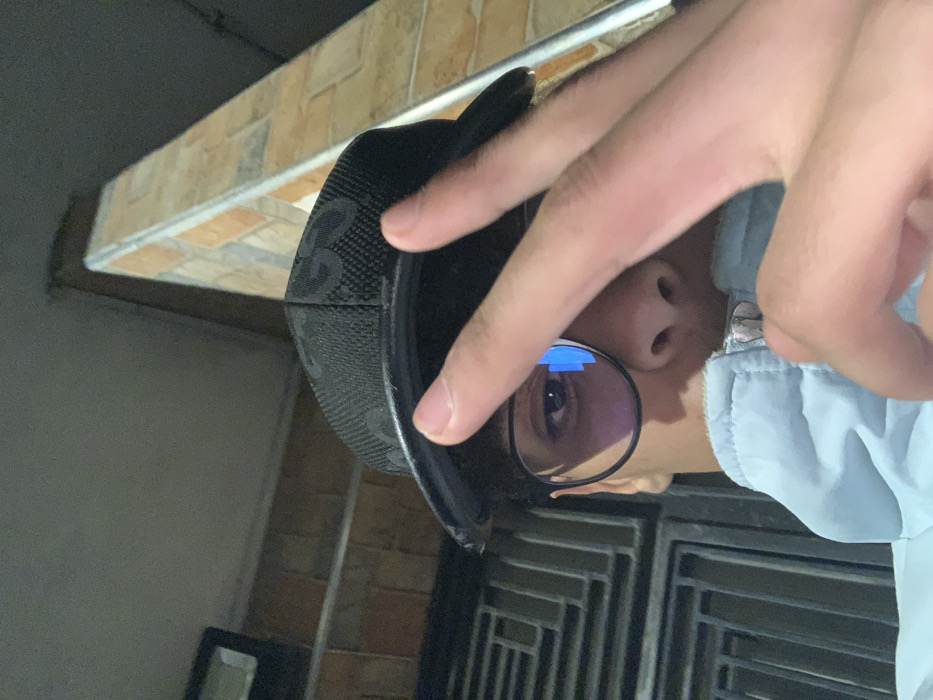 A person wearing a black cap with a "GG" pattern and round glasses is captured in a low-angle shot. They are partially obscured by their hand held up near their face. The individual's nose and one eye are visible. The person appears to be wearing a light blue collared shirt or jacket. The background includes a wall with brick accents and a decorative metal gate. The overall lighting is dim.
