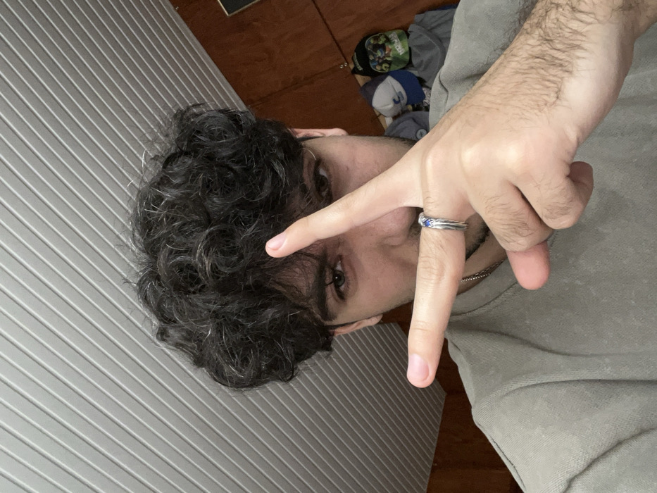 A male individual is depicted in a close-up, self-portrait photograph. He possesses dark, curly hair, light brown eyes, and visible stubble. He wears a solid grey, long-sleeved garment, likely a sweatshirt. His right hand is raised, forming a "V" shape with the index and middle fingers, partially obscuring the lower portion of his face, including his nose and mouth. A silver-toned ring, featuring a small blue stone, is worn on the ring finger of his right hand. The background consists of a light-colored, ridged ceiling on the upper left and a dark, wood-paneled wall on the right. On the wood-paneled wall, several items are visible, including what appears to be a blue and white baseball cap and a green, patterned fabric item, possibly another cap or small backpack, hung or stacked. The specific location within Pudria, Bulgaria, is not discernible from the provided visual information.