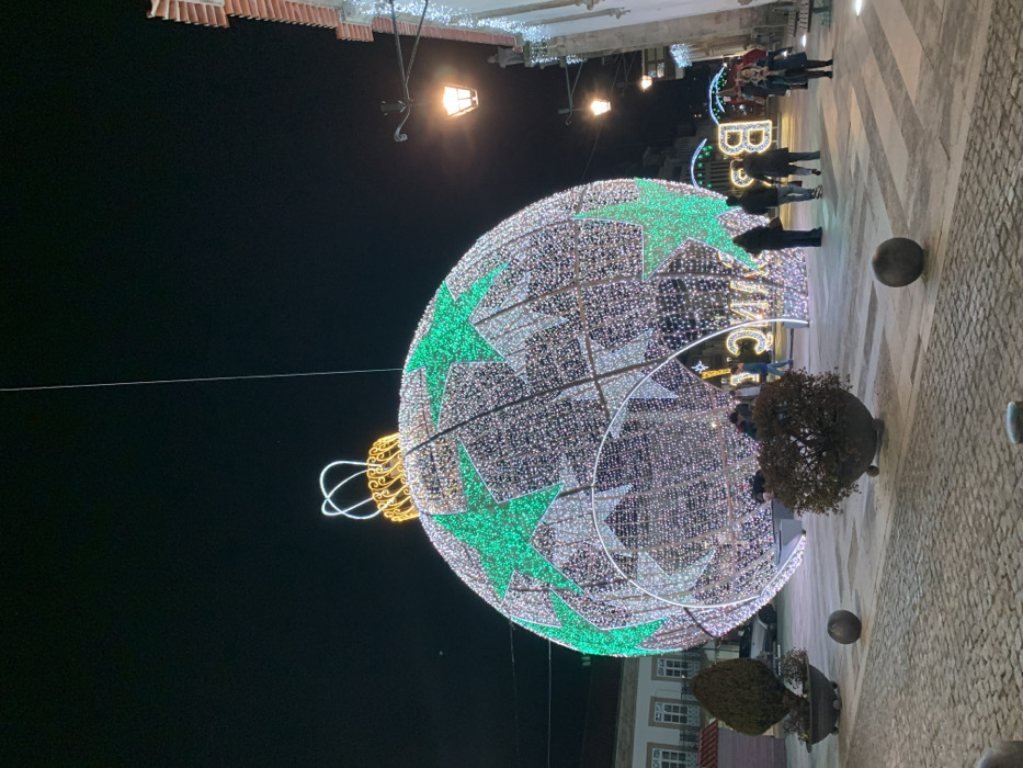 An outdoor scene at night features a large, illuminated Christmas ornament. The ornament is spherical, primarily white with green star accents, and hangs by a gold, decorative top. Pedestrians stroll along a brick-paved area with planters. A lighted "B" and other indistinct letters suggest a festive sign in the background. Streetlights illuminate the architectural details of the buildings lining the walkway.