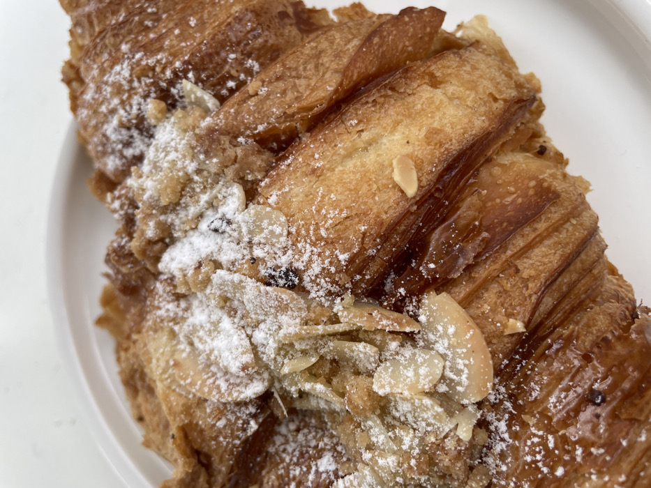- "The image displays a close-up, slightly angled view of a golden-brown pastry, appearing to be an almond croissant or similar laminated baked good, resting on a white ceramic plate or surface" by FM-k41Xm2, licensed under CC BY 4.0