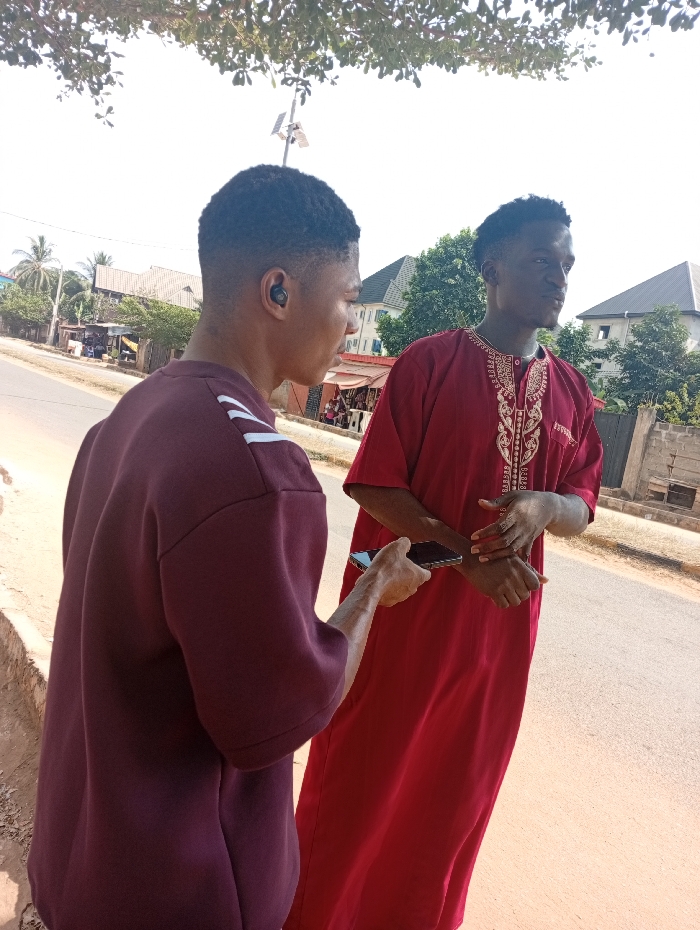 Two young men stand on a street under tree shade. One, facing away, wears a dark purple sweater with white shoulder stripes and a wireless earpiece. He holds a dark smartphone. The other, facing right, dons a red, long-sleeved tunic with ornate gold embroidery around the neckline. The background features a street, buildings, and greenery, suggesting an urban setting. The lighting is bright, casting soft shadows.