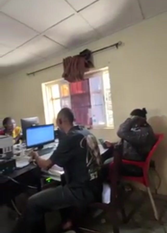 n office space. There are at least six people in the room. One man sits at a desk and uses a computer. A second man sits in a red chair and appears to be looking at a phone. Three women sit at a second desk. A man sits on a patterned couch on the opposite side of the room. A printer sits on the desk next to the man at the computer. The office has tiled ceilings, beige walls, a window with blinds, and an air conditioner mounted near the ceiling. The video appears to be taken from a low angle.