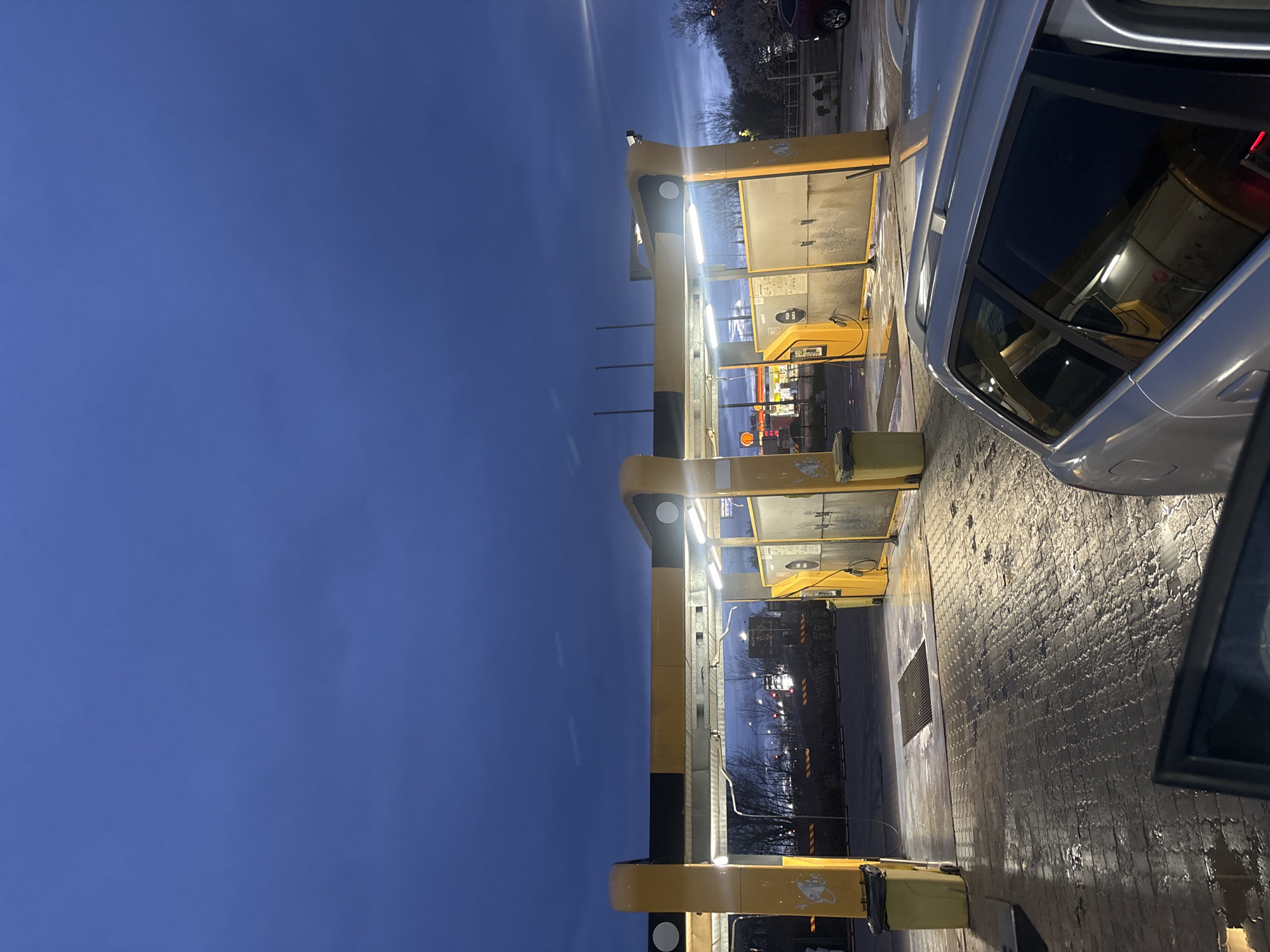 A car is parked at a yellow car wash station in Sofia, Bulgaria, at dusk