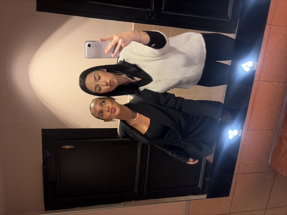 Two young women pose for a mirror selfie in a restroom. One wears a white fluffy sweater and dark leggings, holding a phone. Her dark-haired friend in a black blazer and top stands in front. The mirror reflects the bathroom's beige walls and a black door with a male restroom sign. The black sink has illuminated water droplet symbols with the words "EAU" and "AVO."