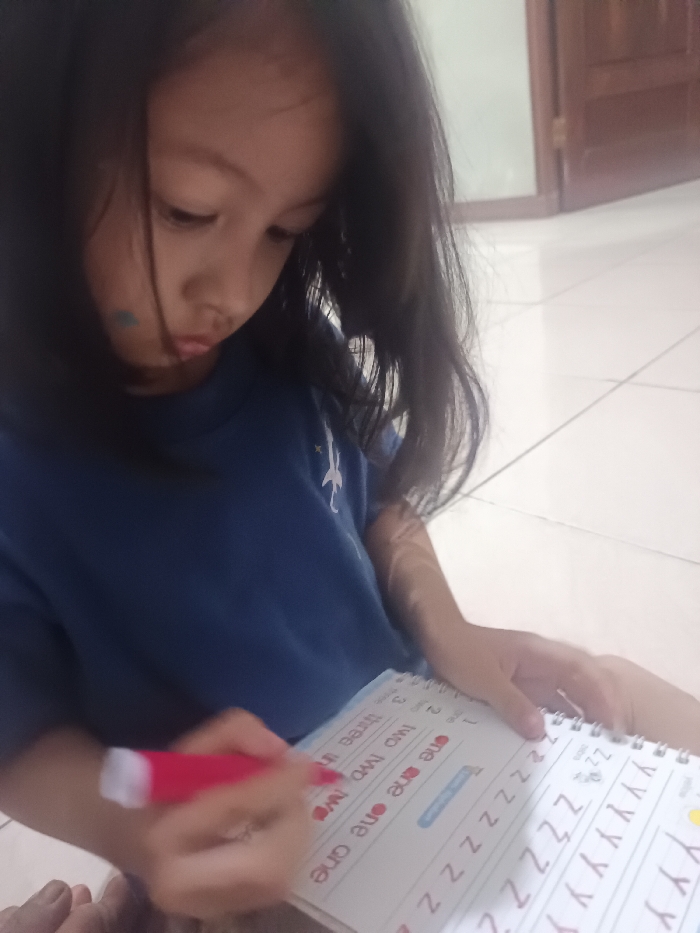 - "An indoor scene in Maleber, Indonesia, depicts a young child, approximately preschool age, with long dark hair, focused downwards on a workbook" by FM-WRTkH2, licensed under CC BY 4.0
