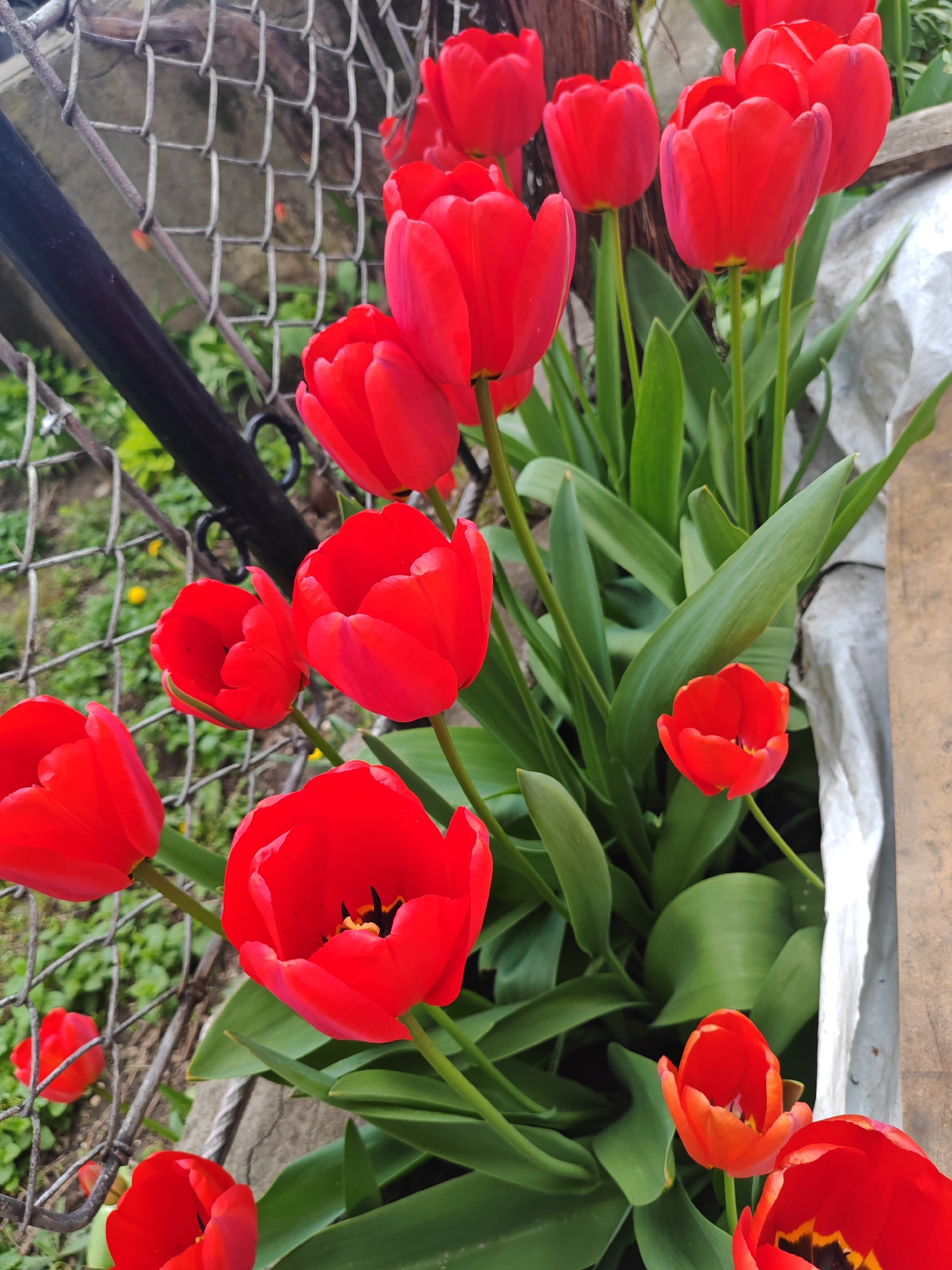 close-up of a cluster of vibrant red tulips in a garden. Some of the tulips are fully open, revealing their dark centers, while others are still budding. Lush green leaves surround the flowers. A chain-link fence runs along the upper left side of the image. A gray, possibly concrete, structure and a wooden plank are visible on the right side, likely forming part of the garden's border or structure. The background behind the fence shows glimpses of greenery and some yellow flowers, suggesting a grassy area. The location is stated as Pancharevo, Bulgaria, though this cannot be confirmed from the image content alone.
