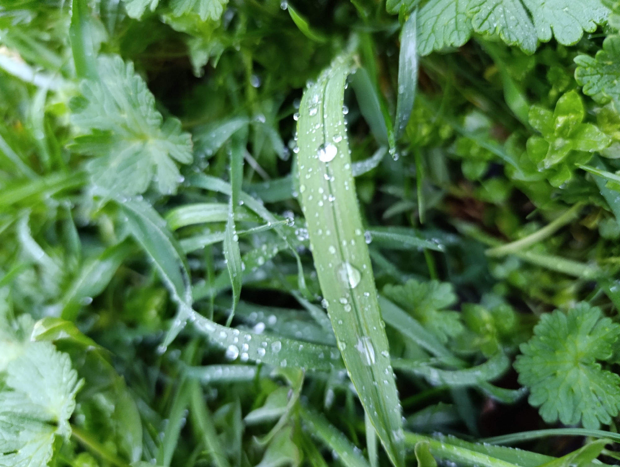 A close-up, outdoor shot of lush green vegetation. Dewdrops are visible on the blades of grass and the leaves of clover-like plants. The scene conveys a sense of freshness and natural beauty. There is no indication of it being located in the city of Haskovo, Bulgaria.
