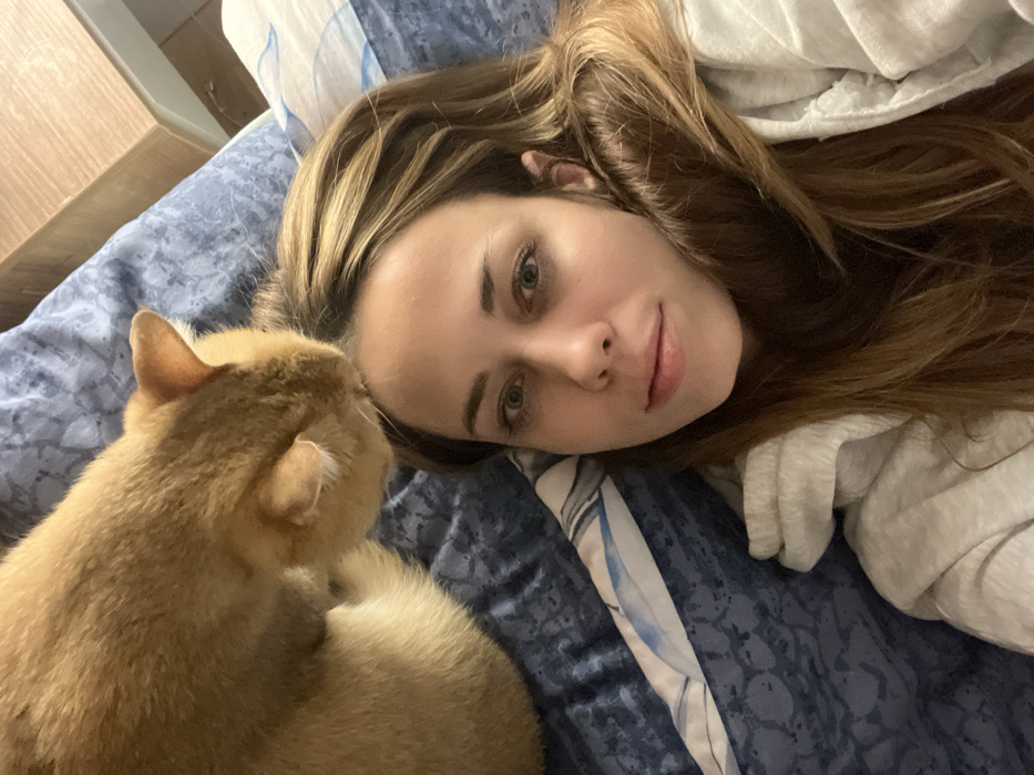 A fair-skinned woman with light brown hair lies on a blue patterned bed, partially covered by a white blanket. Her gaze is directed towards the viewer, with a slight smile on her face. Next to her lies a light orange cat, turned away from the camera, its head near the woman's shoulder. The scene appears to be a candid, intimate moment captured indoors. The soft lighting highlights the subjects' features and adds to the cozy atmosphere.