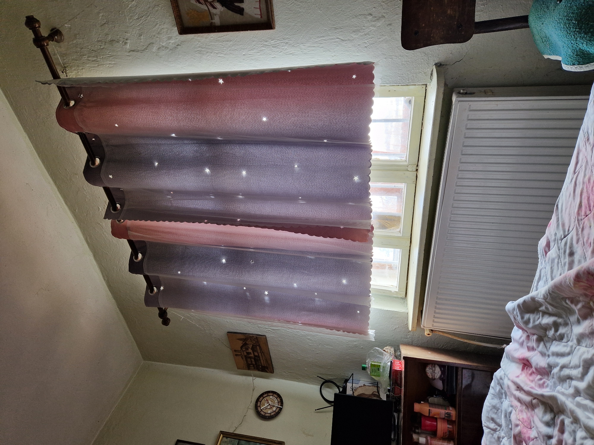 The image depicts an interior scene. A curtain with a pink and grey gradient and star patterns hangs on a rod, partially obscuring a window. A radiator is visible to the right of the window. A wooden cabinet sits below the radiator. Adjacent to the cabinet, are visible personal hygiene items. Below these elements, there is a television monitor. Below these elements are visible a clock and framed paintings. The ceiling and walls are textured. The location cannot be confirmed as Raduvene, Bulgaria based solely on this image.