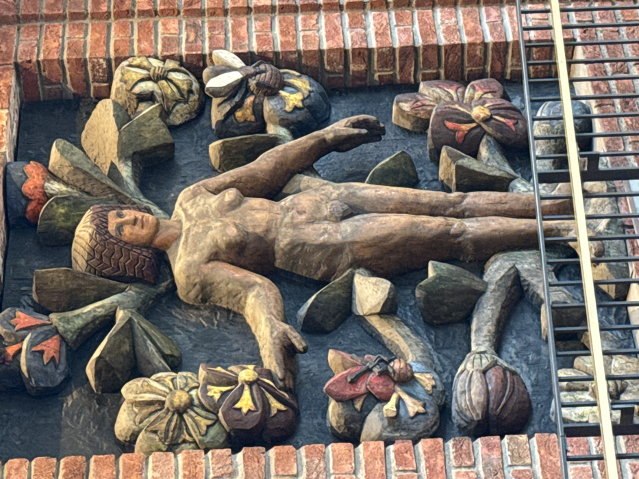 A large wooden relief sculpture, identified as "Jorden" (The Earth) by Per Palle Storm, is depicted mounted on an interior wall within the Oslo City Hall (Rådhuset) in Oslo, Norway. The central subject is a full-bodied, standing nude female figure, carved from wood with a natural, aged finish. She faces slightly to the viewer's right, with a robust physique, prominent breasts, and visible genitalia. Her hair is short, textured, and reddish-brown. Both arms are extended horizontally outwards from her sides, with open hands. The female figure is encircled by numerous stylized wooden carvings of flora and fauna. These include large, multi-petaled flowers and broad leaves, colored in shades of red, orange, yellow, green, brown, and dark blue-grey, set against a darker, textured background. Some elements resemble large butterflies or bees. The entire relief is flanked vertically by sections of red brick wall on both the left and right sides. In the foreground, a black metal railing with a thin gold-colored top rail partially obscures the lower portion of the artwork, indicating a multi-level interior viewing position.