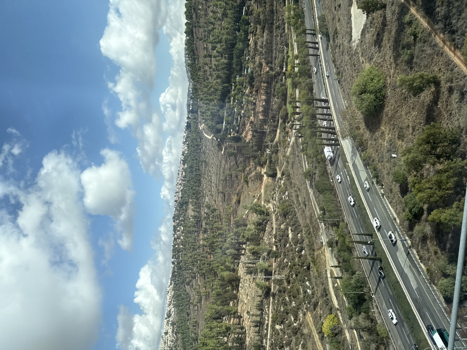 The image presents an elevated, wide-angle view of a natural and urban landscape under a partly cloudy sky. A multi-lane divided highway occupies the lower third of the frame, featuring a central median populated by a row of evenly spaced, tall, slender evergreen trees. Several vehicles, primarily white passenger cars and one white truck, are visible in motion across both directions of the highway. The land immediately bordering the highway consists of dry, scrubby vegetation and sparse trees. Beyond the highway, rolling hills rise, covered with a mixture of dry, light-brown vegetation, scattered green bushes, and numerous conifer trees. Dirt paths or unpaved roads are visible winding through these hills. In the far background, additional hills are densely forested, and perched atop these hills are numerous clustered white or light-colored buildings, indicating a significant settlement. No individuals are visible within the frame. The scene is located in the city of Unknown, Palestinian Territory.