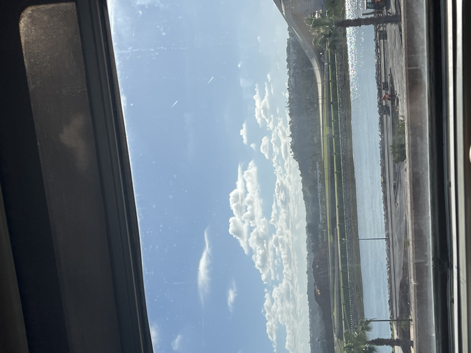 The image presents a daytime view of the Bouregreg River in Salé, Morocco, framed by a dark interior structure, likely a window or sunroof. The upper portion of the frame shows a clear blue sky dotted with scattered white cumulus clouds, with two faint contrails visible in the upper right. The middle ground is dominated by the calm, sun-dappled surface of the Bouregreg River. On the immediate bank (Salé side), a flat, cleared area of dark ground, possibly packed earth or asphalt, is visible. This area contains stacked construction materials, including wooden pallets and orange safety barriers. Two individuals, both wearing orange high-visibility vests, are present on this cleared bank. One stands near the center-right amidst the materials, while the other is positioned further right, adjacent to a small orange excavator. A slender palm tree stands upright on the far right of this near bank, its leaves partially obscured by the window frame. Across the river, the distant bank (towards Rabat) features green, landscaped terrain with rolling hills covered in vegetation. A significant mound of reddish-brown earth is visible on the far left of the distant bank. On the far right, a large, modern architectural structure with a curved, light-colored facade is visible, situated near the distinctive arched design of the Hassan II Bridge, which spans the river connecting Salé and Rabat. A second, taller palm tree stands on the distant bank near the bridge structure.