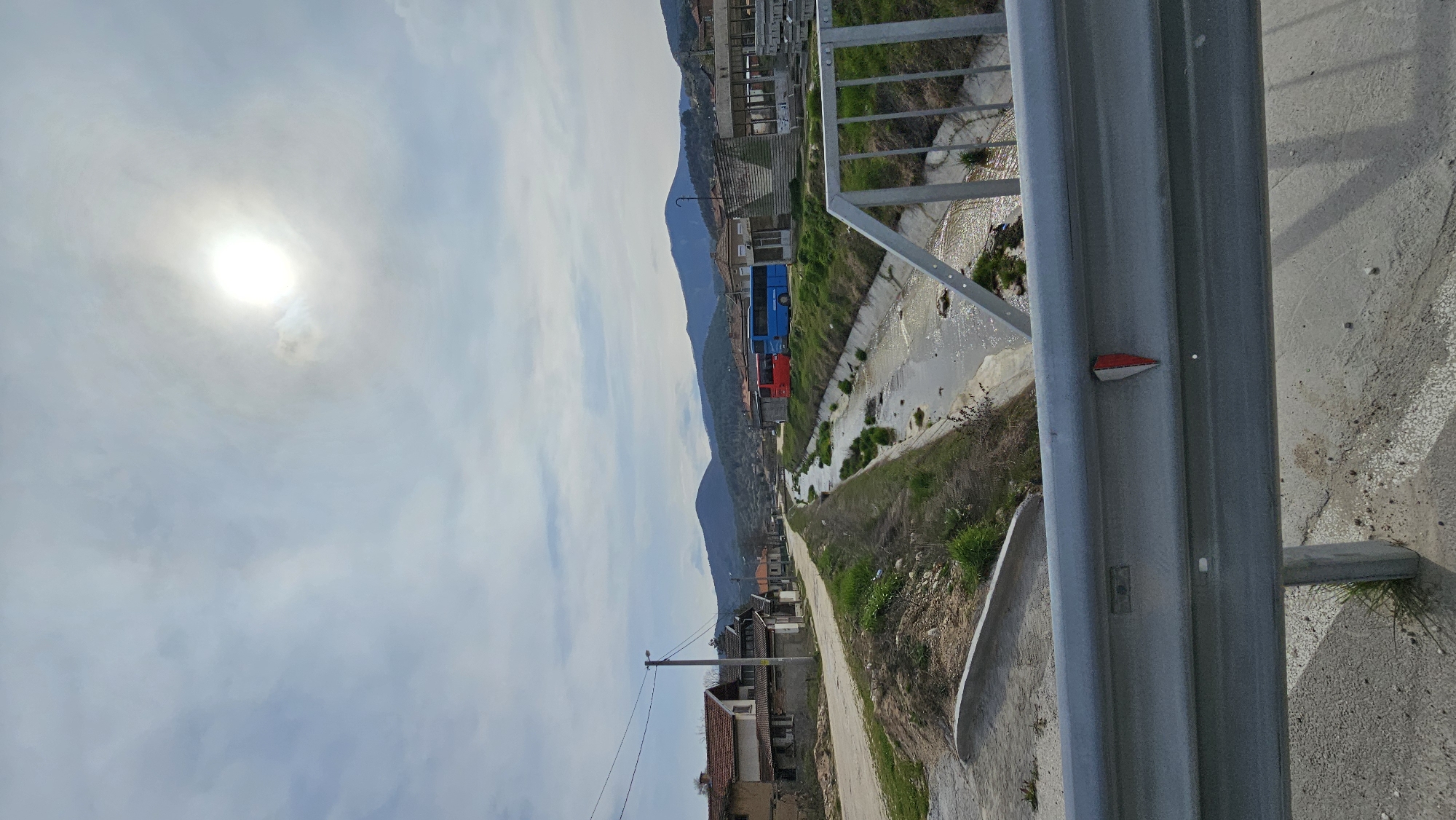 view of Slatina, Bulgaria, from a bridge. The sky is cloudy with the sun shining through. In the distance, there are mountains and buildings. A red and a blue bus are parked next to a waterway. The foreground includes a metal guardrail on the bridge and a concrete surface. A reflector is attached to the guardrail. A road runs alongside the waterway. Houses are visible on the left of the road. A utility pole stands near the houses.
