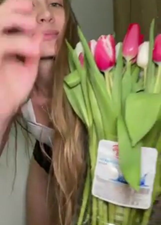 A young woman with long hair smiles at the camera while holding a large bouquet of tulips. The tulips are in a clear plastic bottle filled with water, which the woman is holding close to her body. She is wearing a white tank top and dark bottoms. The background is a simple room, possibly a kitchen, with neutral-colored walls. The lighting is bright and even. There is music playing in the background, contributing to a cheerful atmosphere.