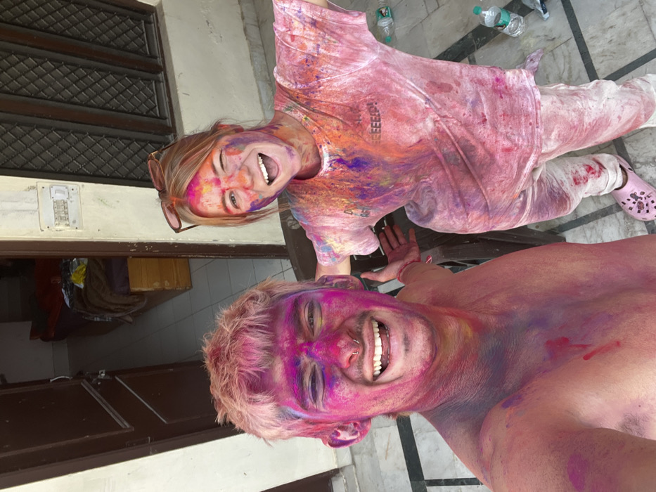 Two individuals, a male and a female, are depicted covered in multi-colored powders, consistent with a Holi festival celebration, in what appears to be a residential outdoor or semi-outdoor area in Rishikesh, India