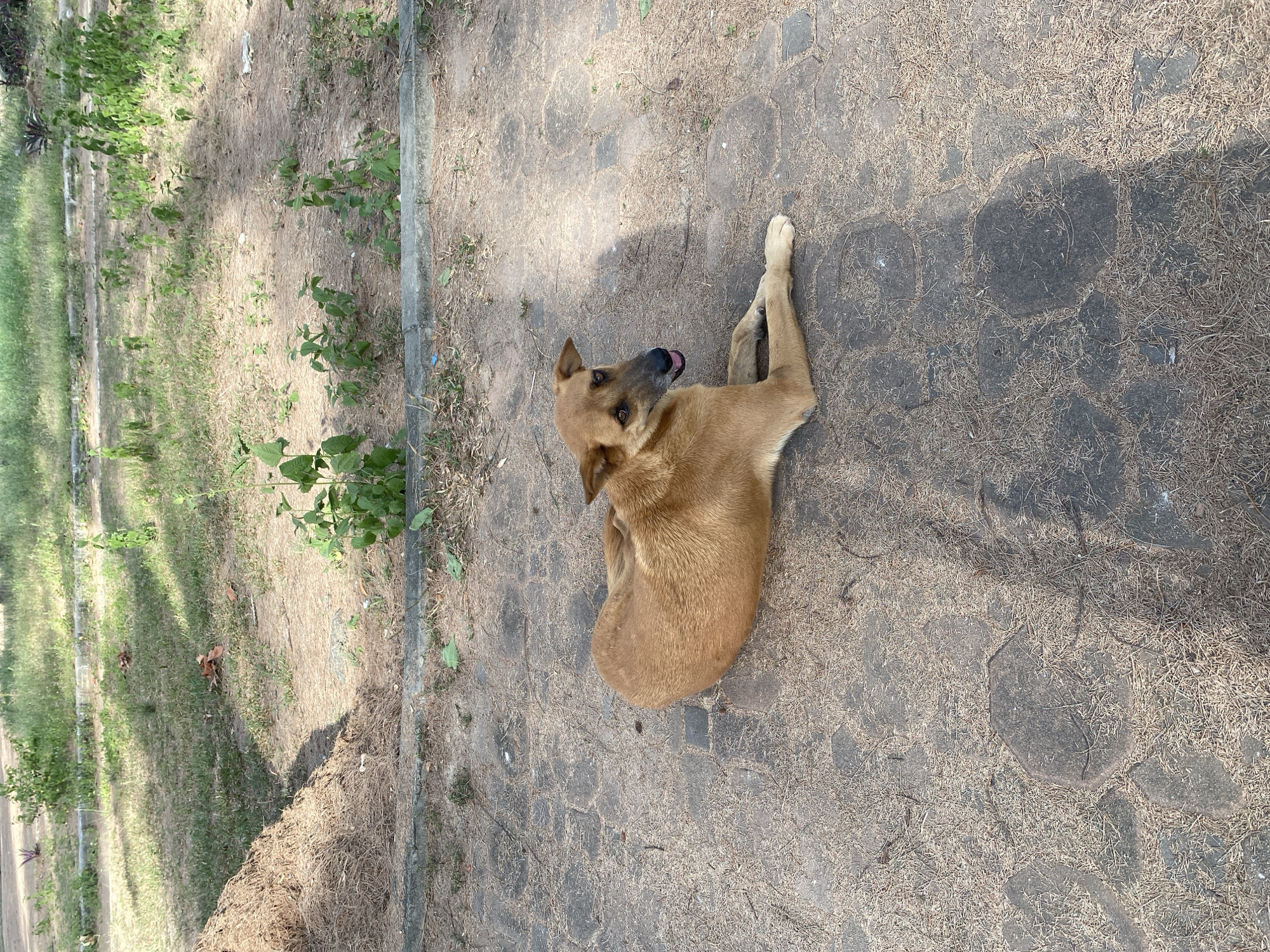 A tan-colored dog lies on cracked pavement covered with dried pine needles. The dog is resting with its head turned upwards, its tongue slightly protruding. The pavement borders a grassy area with small trees and a concrete edge. The location is Tambon Mai Khao, Thailand.