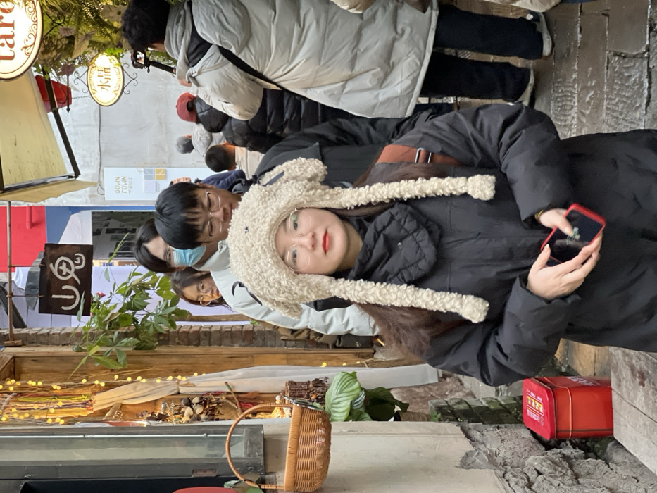 A group of people standing outside a storefront on a narrow street. A young woman wearing a fluffy hat and glasses holds a red phone, facing the camera. Behind her, others stand, some wearing glasses and a face mask. A wicker basket sits on a ledge, with a red box partially visible on the ground. Festive lights decorate the store front.