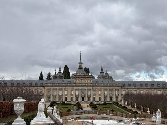 The image presents a wide view of the Royal Palace of La Granja de San Ildefonso and its formal gardens in Real Sitio de San Ildefonso, Spain, under a heavily overcast sky