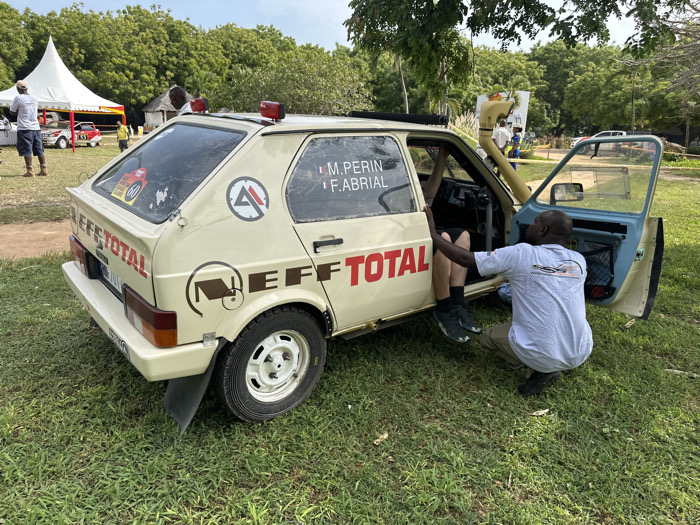 The scene in Gombato Bongwe ward, Kenya, depicts a beige two-door hatchback rally car parked on a grassy area under clear daylight. The car bears red "EFF TOTAL" decals on its side and rear, "M. PERIN F. ABRIAL" on its rear side window, a circular logo with a stylized 'A', and another logo with "N EFF." It is equipped with a roof-mounted snorkel on the passenger side, two red lights on the roof, a rear spoiler, and mud flaps behind the rear wheels. The passenger door is open. A light-skinned individual, clad in dark shorts and athletic shoes, is partially seated in the passenger seat, with their left leg visible. A dark-skinned male, wearing a light grey t-shirt with a racing motif and khaki trousers, is crouched beside the open passenger door, his hands near the door frame. In the background, a white event tent is visible to the left, with several individuals standing nearby, one in a white t-shirt and dark shorts. A dense backdrop of tall, green trees extends across the scene.