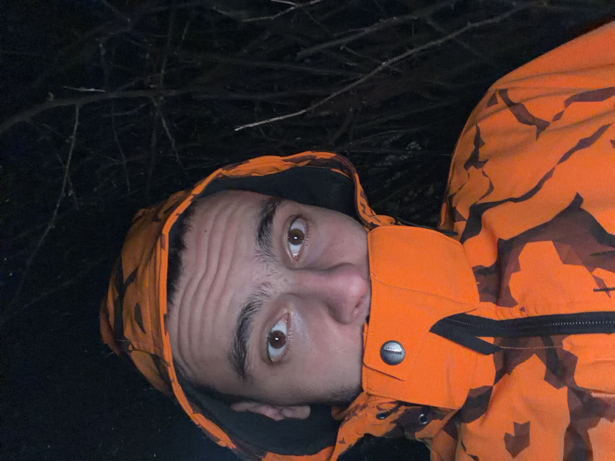 A man wearing an orange hooded jacket with a black camouflage pattern is looking at the camera