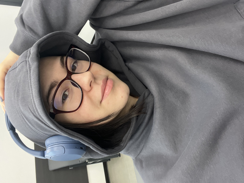 A single individual, identified as female, is depicted from the upper torso within an indoor waiting area. She has dark hair, partially visible, and wears a grey hooded sweatshirt with the hood up. Dark reddish-brown framed eyeglasses are worn on her face. Light blue over-ear headphones are positioned over the hood, with the left earcup clearly visible. Her left hand, featuring light blue or lavender nail polish, is raised and resting on the top of her head/hood. The individual looks directly towards the camera with a slight smile. The background features a light-colored wall with a dark horizontal strip or baseboard. To the left, a portion of dark-colored, institutional-style seating is visible, suggesting a public waiting lounge environment. This scene is consistent with a public waiting area such as Odesa International Airport in Odesa, Ukraine.