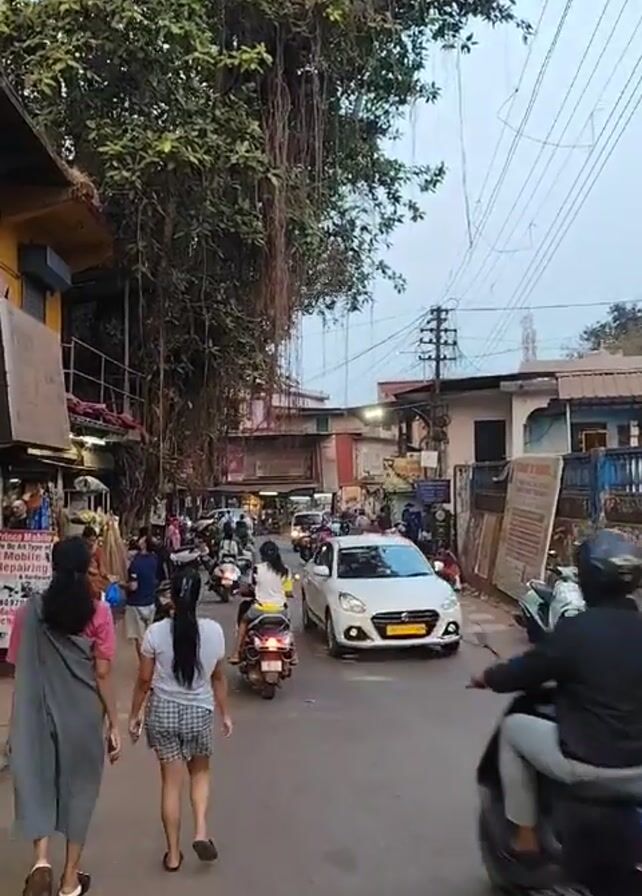 street in what appears to be a town in India. People are walking along the street, and others are riding motor scooters and driving cars. The street is lined with buildings, some of which have shops or businesses on the ground floor. Overhead, there are power lines and a large tree with many aerial roots. The sky is overcast, suggesting it may be early morning or late afternoon. The camera follows two women walking down the street, away from the camera. The general atmosphere seems lively and bustling.