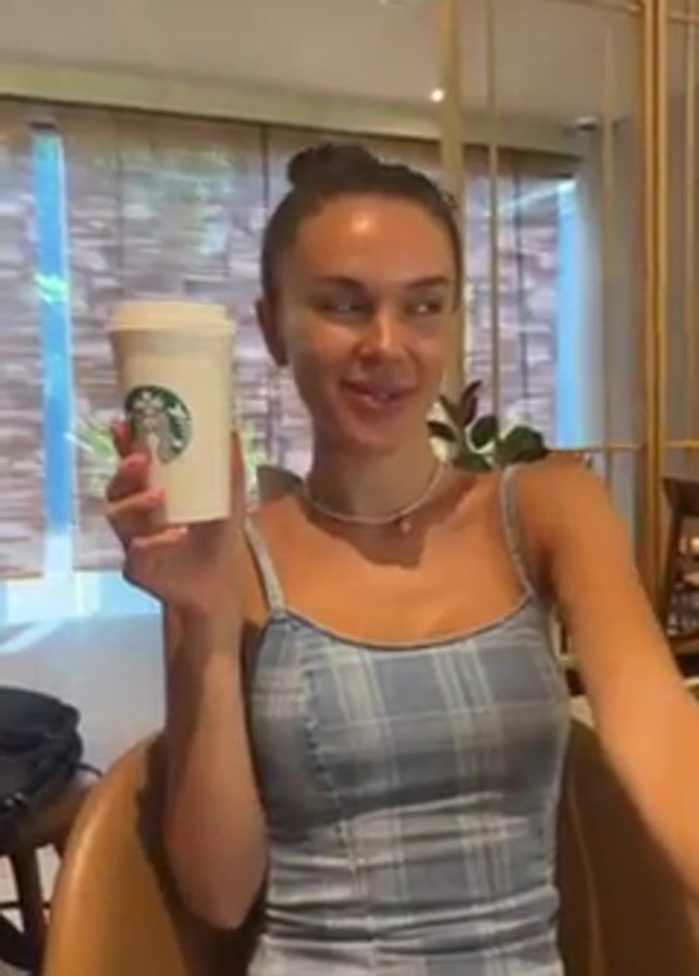 young woman with her hair in a bun, wearing a blue and white plaid dress, holding a Starbucks cup