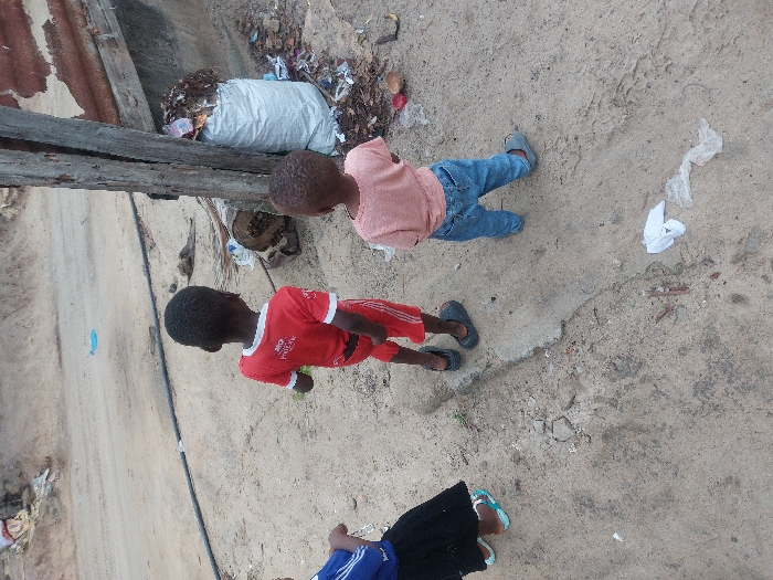An outdoor scene in Mwandege, Tanzania, depicts three children standing on a sandy, unpaved surface next to a dirt road. In the foreground-left, a child, partially visible, wears a blue top, black skirt, and light blue sandals. In the center, a child wears a red t-shirt with white trim and text, red shorts, and dark grey clogs, facing away from the camera towards the road. To their right, a younger child wears a peach t-shirt, blue jeans, and light grey shoes, also facing away from the camera. To the right of the children, a weathered, vertically oriented wooden post with a visible crack stands next to a white woven sack filled with refuse, including plastic bottles and other debris. Behind the post and sack, a piece of corrugated metal is visible. Scattered refuse, including plastic and organic material, lies on the ground around the post and sack. A black pipe runs horizontally across the mid-ground, traversing the sandy terrain. The background features a wider dirt road with visible tracks, and distant, indistinct structures or mounds of earth. The ground is primarily dry earth and sand, with scattered small pieces of white plastic and other debris in the foreground.