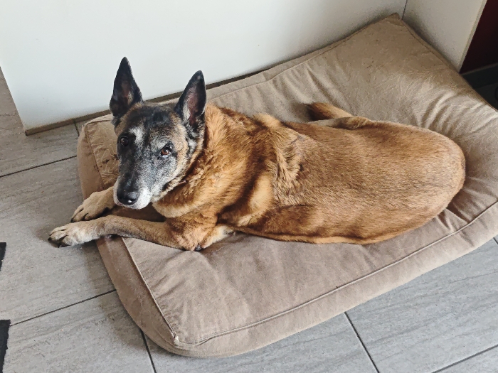 - "An adult dog, appearing to be a Belgian Malinois or similar shepherd breed, is lying on a light brown fabric dog bed" by FM-JIUA53, licensed under CC BY 4.0