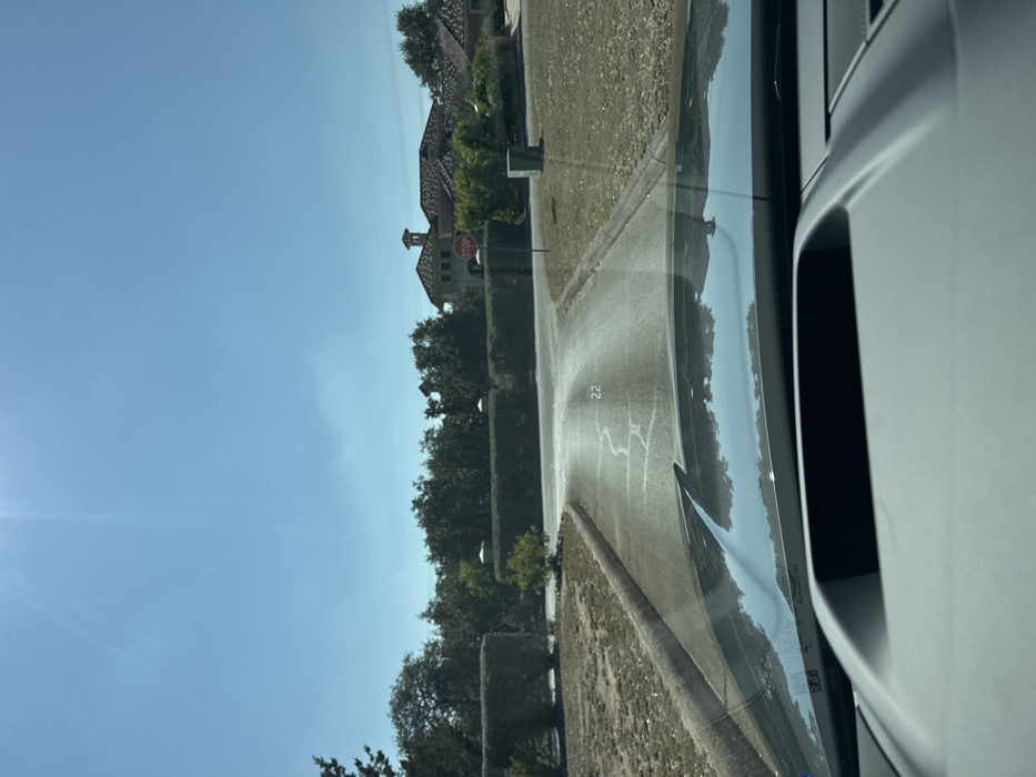 A road with a building and trees visible. A stop sign is present near the building. The road appears to be slightly cracked and reflective, and the image is taken from inside a car, as part of the dashboard is visible. The sky is blue with a hint of sunlight.