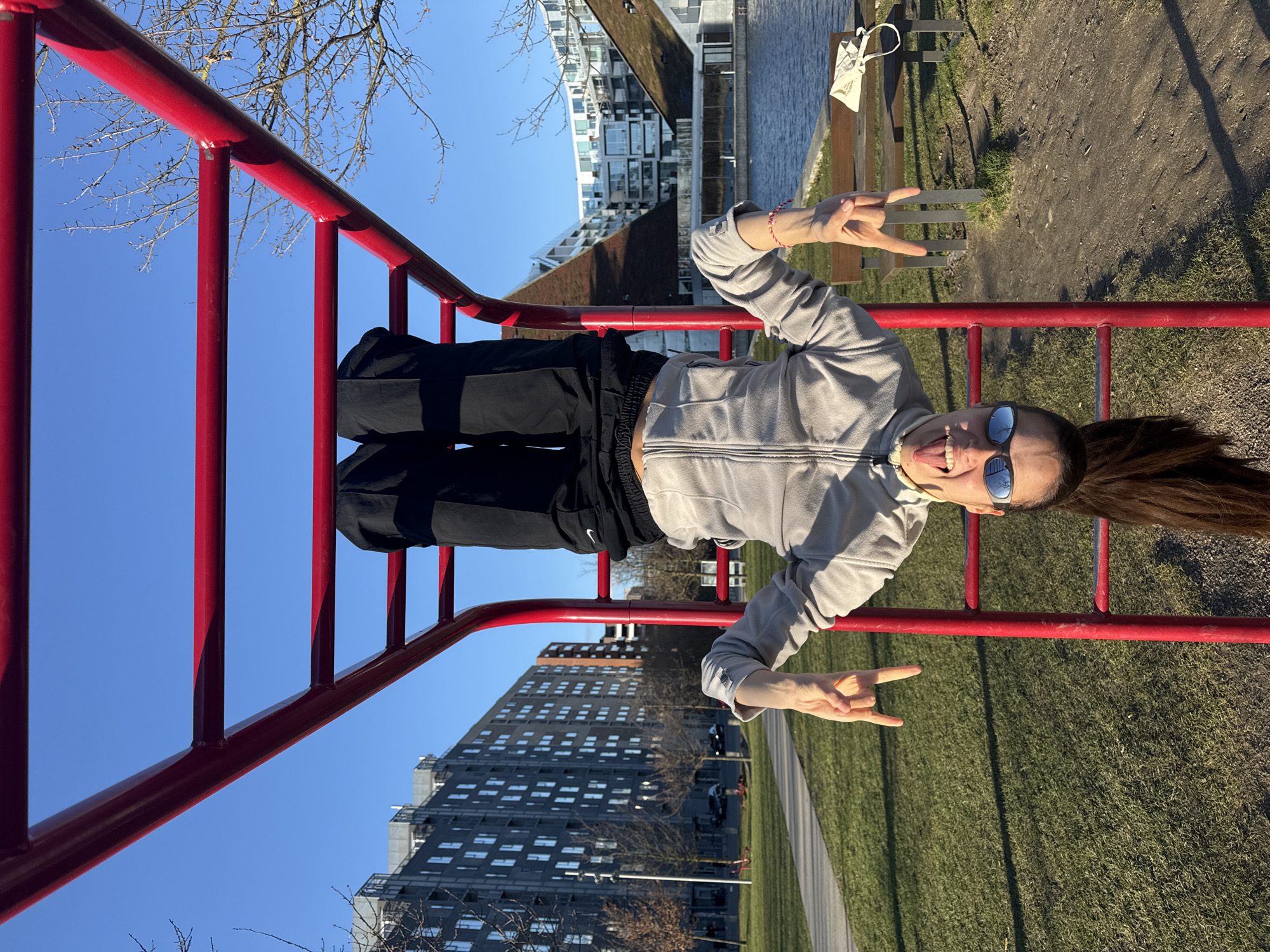 A young woman in a gray zip-up jacket, black pants, and sunglasses hangs upside down on a red metal jungle gym in a park. She is making a "rock on" hand gesture with both hands and sticking her tongue out. The background includes modern apartment buildings, a canal, a grassy area, and a walkway. The location appears to be Copenhagen, Denmark, based on the architecture and general environment.