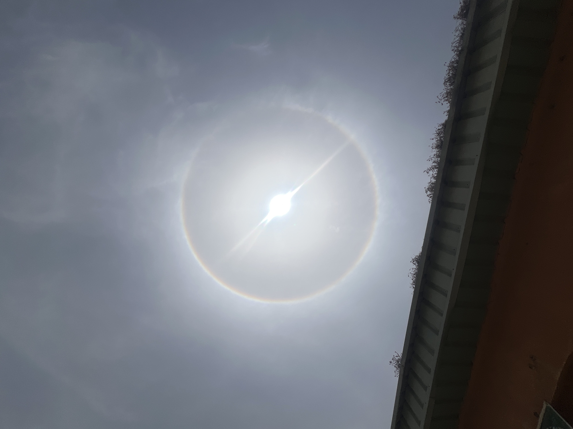 22° halo around the sun, visible in the sky over Minna, Nigeria. The sky is overcast with thin clouds. Part of a building with a reddish-brown exterior and a white or light-colored overhang is visible in the upper right corner of the frame. Small plants or vines are growing on the edge of the overhang. The sun is bright with rays emanating from it, and the halo is a faint ring of light surrounding the sun.