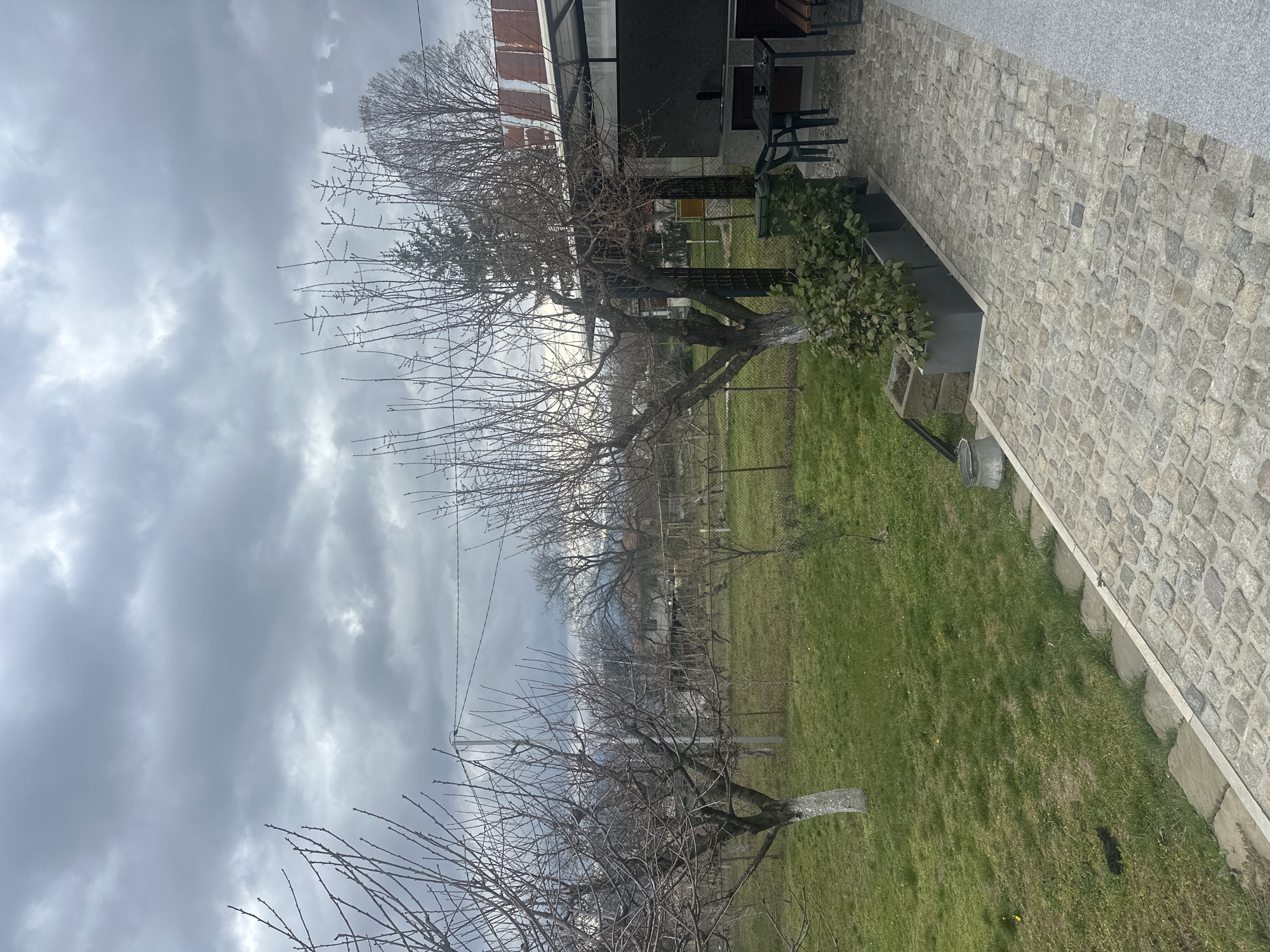 The image depicts an outdoor garden and patio area in Sopot, Bulgaria, under a heavily overcast, grey sky. The scene is devoid of human presence. In the foreground, a multi-textured paved surface occupies the lower right quadrant. This consists of light grey cobblestones transitioning to a smooth, dark grey granite slab on the immediate right. A black downspout is visible on the cobblestone, terminating over a silver-colored metal bucket. Adjacent to the paving, three dark grey rectangular planters contain dense green shrubbery. Further right, under a translucent corrugated roof structure supported by dark framing, an outdoor area features a dark counter, a dark outdoor table, three dark chairs, and part of a wooden bench. Above this structure, a section of a rusted reddish-orange corrugated metal roof is visible. The central and left portions of the midground are dominated by a manicured green lawn. Several deciduous trees with bare branches, some exhibiting white-painted lower trunks, are scattered across the lawn. A small, young olive tree is present on the right side of the lawn. A chain-link fence runs horizontally across the midground, separating the immediate lawn from a further vegetated area. In the background, a two-story building with a reddish-orange corrugated metal roof is partially visible through the bare trees and vegetation, slightly to the right of the center. Utility poles and overhead power lines traverse the upper midground. Distant mountainous terrain is faintly discernible through the haze and trees. The sky is uniformly grey and heavily overcast throughout the entire upper portion of the frame, indicating no direct sunlight.
