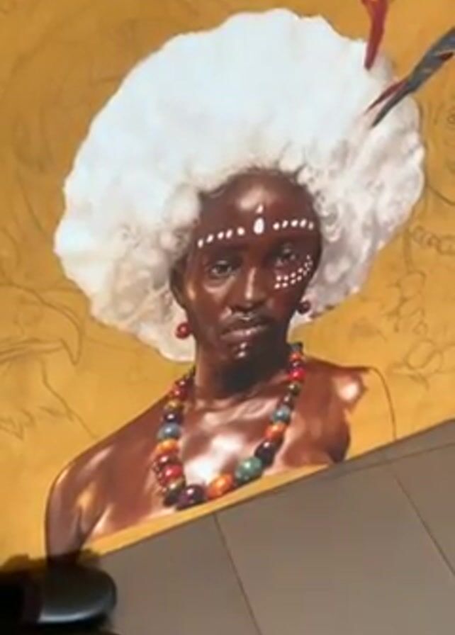Here is a brief description of the video: The video shows a painting on a tan surface. The painting is a close-up of a person with dark skin, a white afro-like hairstyle, and a colorful beaded necklace. There are also white markings on the person's face and feathers in their hair. The background of the painting is a solid tan color with faint sketches of other figures. A pair of black clogs are visible at the bottom of the frame, on a tiled floor.