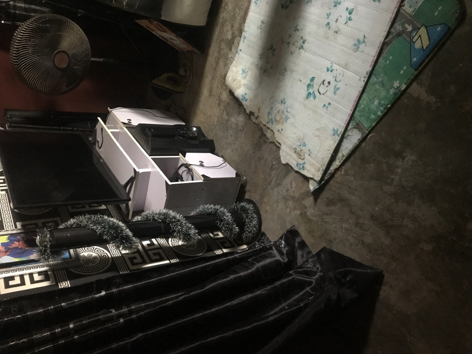 The scene depicts an interior room in Oba-Ile, Nigeria, characterized by dim lighting. In the mid-ground, a black flat-screen television rests on a white, multi-shelf entertainment unit. Below the television, cables are visible on an open shelf. A black speaker unit is positioned to the right of the TV stand. Behind the television setup, the wall is covered with black and white geometric patterned wallpaper, on which a framed picture of two individuals is mounted. To the left of the entertainment unit, a tall, slender object, possibly another speaker or support column, is wrapped with a shaggy grey and white tinsel-like decoration. Further to the left, dark, pleated curtains are drawn. On the right side of the image, a brown standing fan with a circular grill cover is situated against a reddish-brown wall. Below the fan, a dark clothes iron with a yellow cord is on the floor. A portion of a large white appliance or cabinet is visible in the far right background. The floor is composed of unpolished concrete. In the foreground, two overlapping rectangular floor mats are present. The top mat is predominantly white with a light blue floral pattern, showing significant wear, soiling, and a torn edge. A second mat, patterned in green and other colors, is partially visible beneath the first. No individuals are visible within the frame.