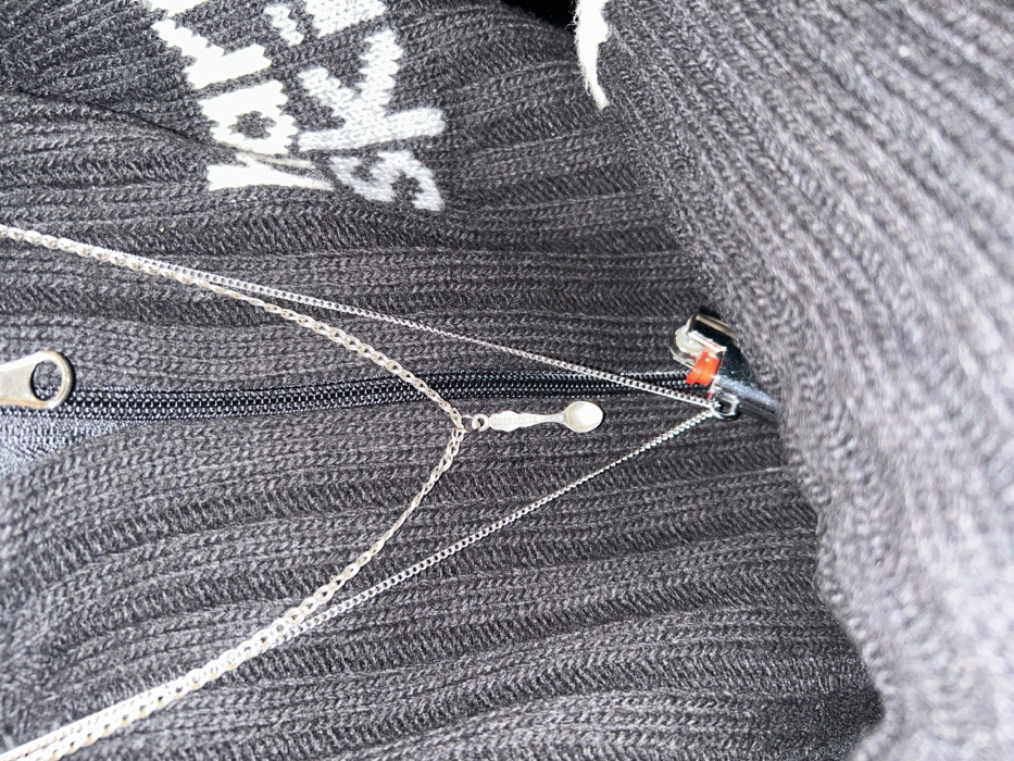 A close-up image depicts the upper torso of an individual wearing a dark grey, ribbed knit zippered garment. A black zipper with a silver-colored pull is visible down the center. On the viewer's left side of the garment, white embroidered text is partially visible, displaying "Har" on one line and "SKI" below it. Two silver-colored necklaces are draped over the garment. The upper necklace is a finer chain with a small, decorative silver-colored spoon charm. The lower necklace is a slightly thicker chain, from which a black disposable lighter with an orange push-button and metallic top is suspended against the fabric. The location in the city of Dnipro, Ukraine, cannot be determined from the visual information presented in the image.