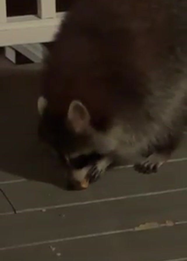 A raccoon is standing on a gray wooden deck. It is eating a small orange piece of food. There are also some small pieces of crumbs on the deck around the raccoon. A white railing is in the background. People are talking in the background.