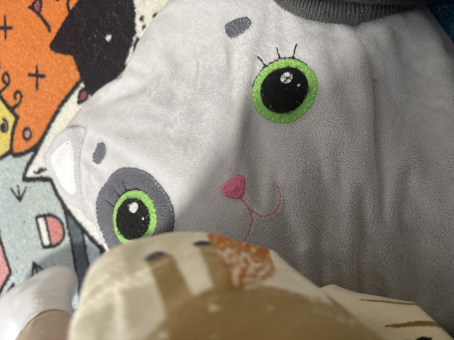 A gray, fleece-like cat-shaped pillow with stitched-on green-trimmed black eyes and a pink stitched nose sits partially obscured