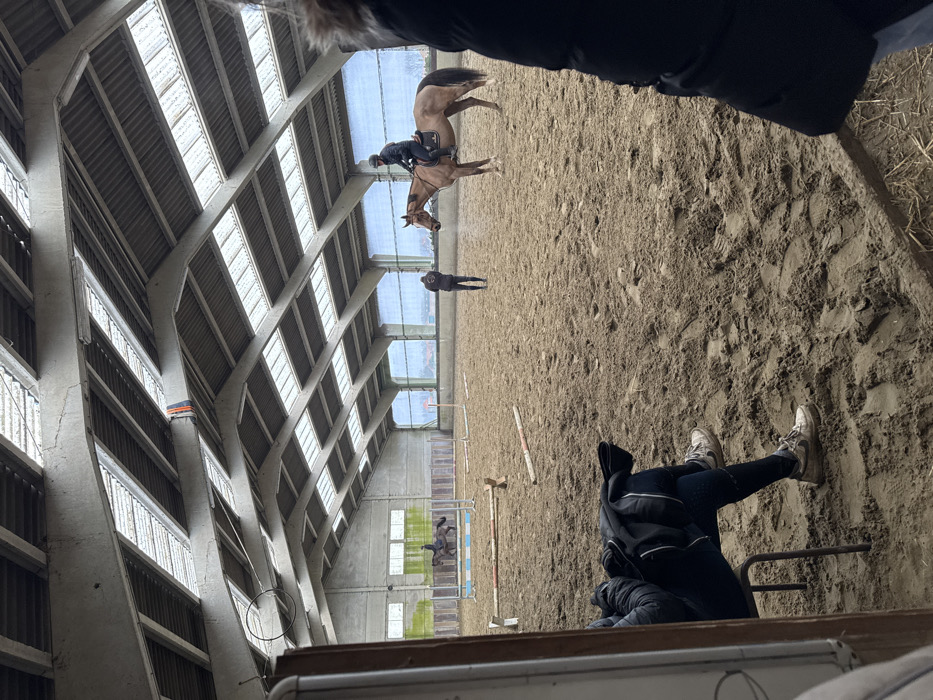 The image depicts an indoor equestrian riding arena located in Estaimpuis, Belgium. The scene is illuminated by natural light filtering through numerous translucent skylight panels integrated into the high, vaulted ceiling, which features exposed concrete beams. The arena floor consists of disturbed sand or dirt, exhibiting various hoof prints and tracks. In the mid-ground right, a rider, wearing a dark helmet and dark jacket, is mounted on a stationary light brown horse with a dark mane and tail. The horse is equipped with a dark English-style saddle and faces left. Slightly to the left of this pair, a person in dark clothing stands on the arena floor, facing away from the camera, appearing to observe the horse and rider. In the background left, another rider, also in dark attire, is mounted on a dark horse, positioned near several low equestrian obstacles, including blue and white striped poles and wooden rails set on standards. The arena's perimeter walls are light-colored, with a section displaying green discoloration or moss on the lower left portion. In the immediate foreground, to the left, a person is seated on a dark metal stool; only their lower body is visible, clad in dark pants and white sneakers, with a dark jacket draped over their lap. To the immediate foreground right, the upper right shoulder and part of the head, covered by a dark, fur-hooded jacket, of another individual are visible, indicating their presence as an observer. A circular metal hoop is suspended from one of the ceiling beams on the left side of the arena.