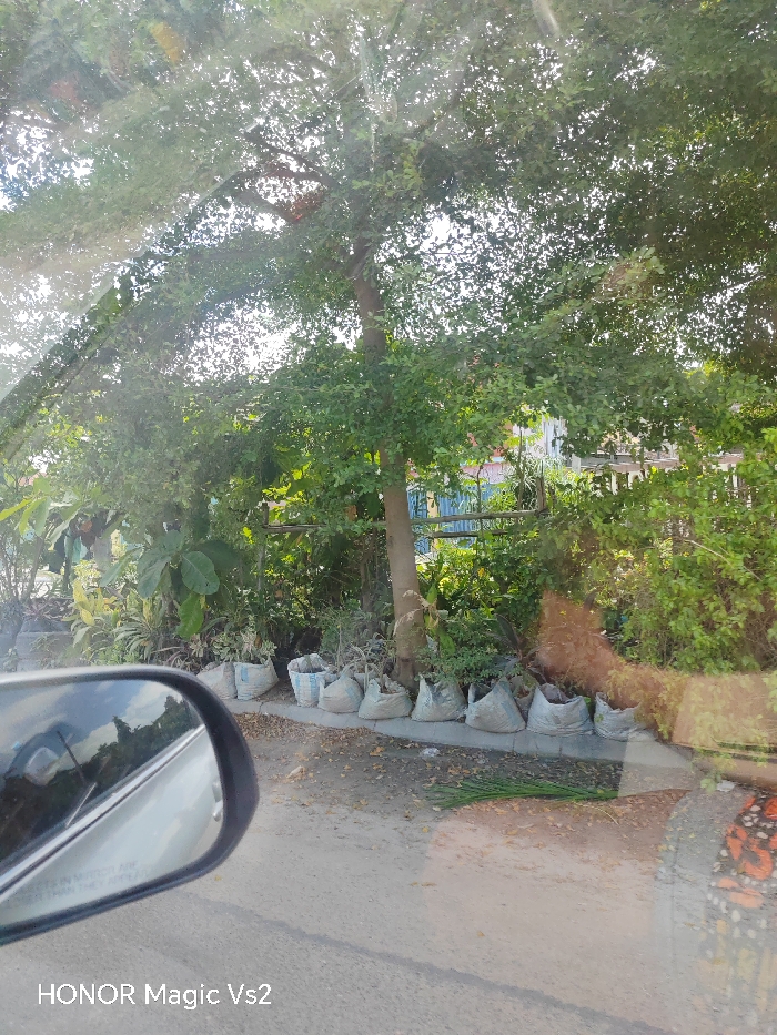This image captures a roadside scene in Festac Town, Nigeria, observed from within a vehicle. In the foreground, the lower-left section displays a silver vehicle's side mirror, reflecting a cloudy sky and distant greenery, with partially visible text "OBJECTS IN MIRROR ARE CLOSER THAN THEY APPEAR." The asphalt road surface occupies the lower portion of the image, showing scattered dirt and a single green palm frond lying horizontally. A reflection of orange, black, and white patterned fabric is visible on the lower-right edge, suggesting a passenger's attire. Along the roadside, a line of approximately ten light-colored, possibly repurposed cement or woven plastic, sacks filled with soil and plants serves as informal planters. These sacks are situated on a slightly raised dirt curb or verge. Immediately behind these planters, dense green vegetation, including various shrubs, broad-leafed plants, and the trunk of a medium-sized tree, fills the midground. A light-colored, horizontal slatted fence, possibly constructed from wood or bamboo, is visible through and behind this foliage. In the background, partial views of residential structures with elements of blue and other muted colors are discernible. The sky above is bright and partially obscured by a dense canopy of trees. The image includes a "HONOR Magic Vs2" watermark in the bottom-left corner. No human figures are directly depicted.