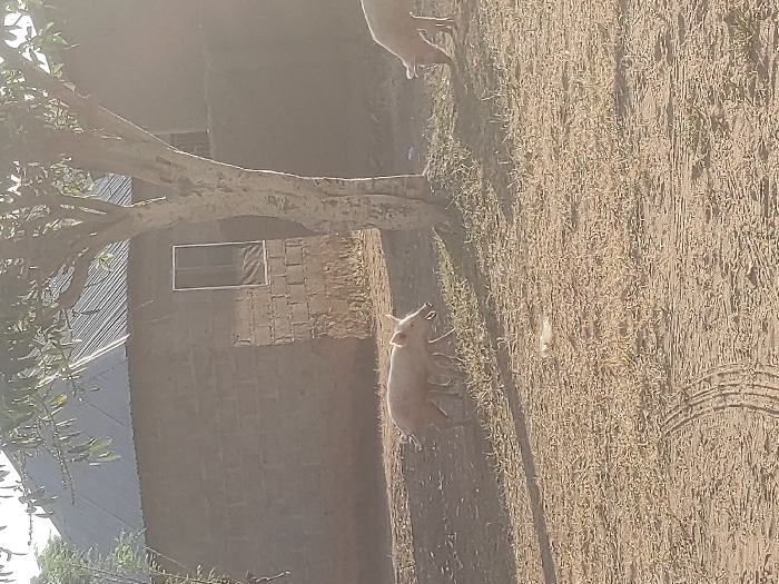 Two light-colored pigs inhabit a yard. One pig is lying down in the dry grass, while the other appears to be foraging at the top. Behind the pigs, a tree branch reaches towards the left side of the frame. Further back, a building with a window and a grey corrugated roof stands under a somewhat hazy sky. The yard surface shows visible tire tracks.