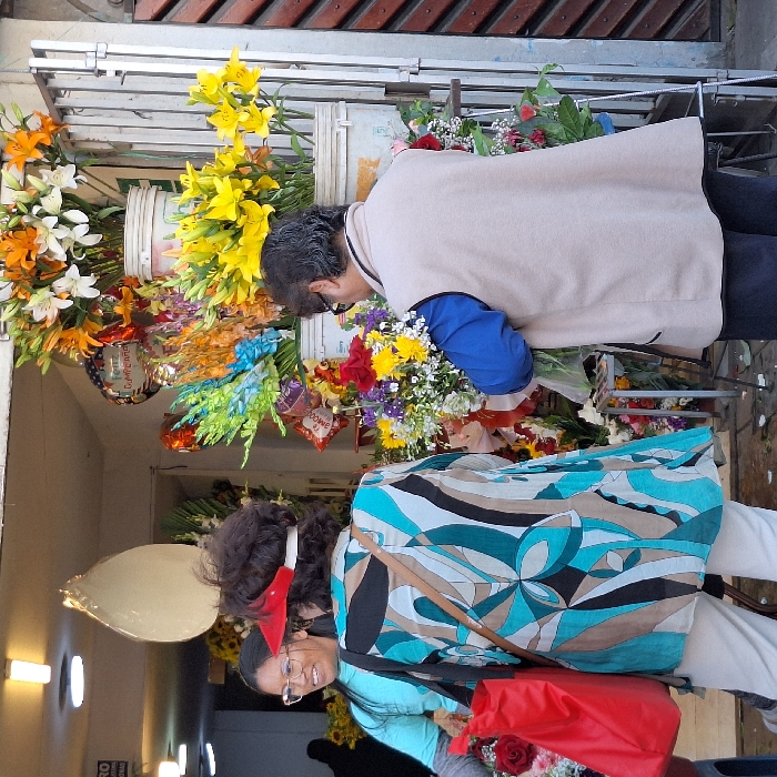 The image depicts a vibrant flower stall or shopfront in José Luis Bustamante y Rivero, Peru. Three individuals are visible. In the foreground, facing away from the viewer, is a person wearing a beige sleeveless vest over a blue long-sleeved shirt, actively arranging or tending to a large bouquet of colorful flowers, including red, yellow, and white blossoms. To their left, also facing away, is another individual wearing a multi-colored long-sleeved top with a teal, black, and tan abstract pattern, a red visor, and carrying a red tote bag over their left shoulder. This person's dark, curly hair is visible. Partially obscured by this individual and to their left, a third person, a woman with dark hair and glasses, wearing a light blue short-sleeved top, smiles and looks towards the right. She appears to be holding a red object, possibly a rose or part of a floral arrangement. The shopfront is densely packed with a variety of fresh cut flowers, predominantly displayed in white buckets. Large bunches of orange, white, and yellow lilies are prominent. Other bouquets feature various colors such as bright yellow, vibrant blue, green, purple, and red. Several festive balloons are also part of the display, including one silver balloon with "Feliz Cumpleaños" (Happy Birthday) text partially visible. The interior of the shop is dimly lit, with overhead fluorescent lights visible, and a partial sign on the upper left wall reading "ERO". To the far right, a brown, slatted, possibly wooden or metal roll-down door or gate is visible. The ground immediately in front of the stall shows scattered floral debris like petals and leaves.