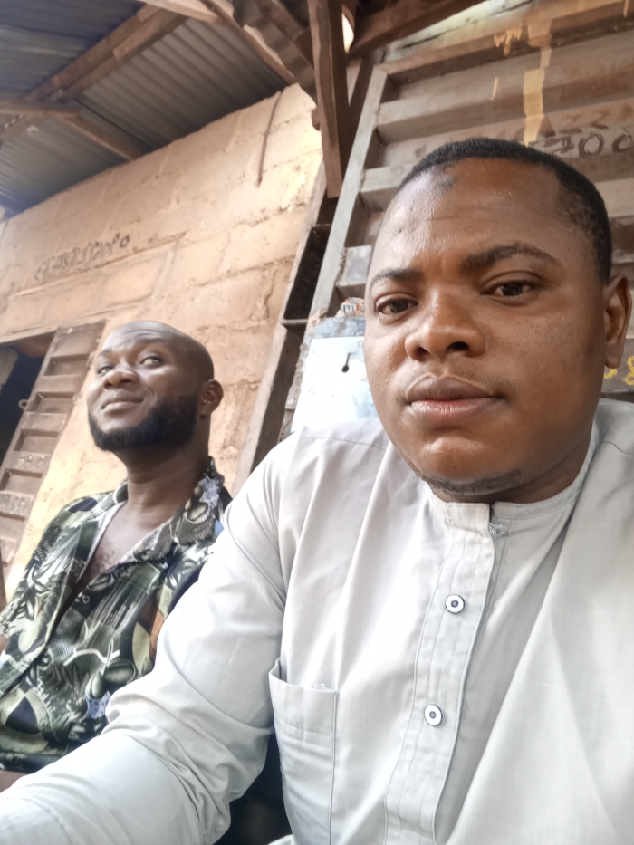 This image depicts two adult males situated within a rustic outdoor or semi-sheltered environment in Akwanga, Nigeria