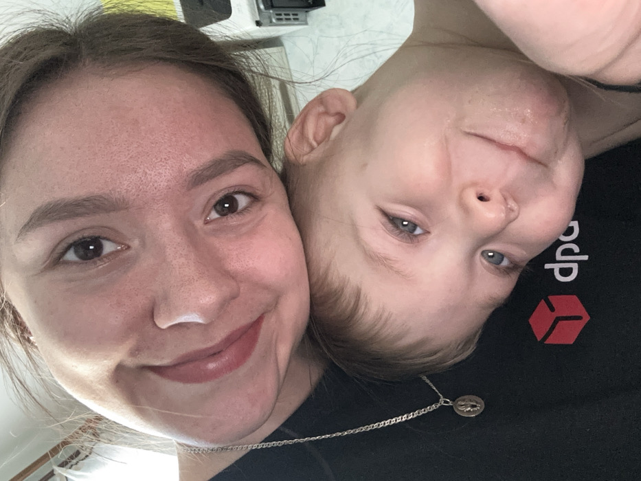 A close-up, high-angle selfie depicts an adult female and a young male child, positioned with their heads touching and tilted