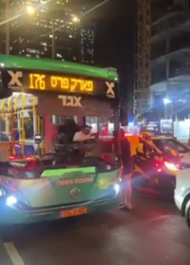 The video depicts a nighttime street scene where a green bus has collided with a yellow car, causing traffic disruption. The bus, displaying the route number 176, has a driver visible inside who gestures while looking at something outside the bus. Several people are gathered near the scene. The surrounding environment includes tall buildings, a crane, and other vehicles stuck in traffic. Red emergency lights are flashing, possibly from emergency vehicles that have arrived at the scene.