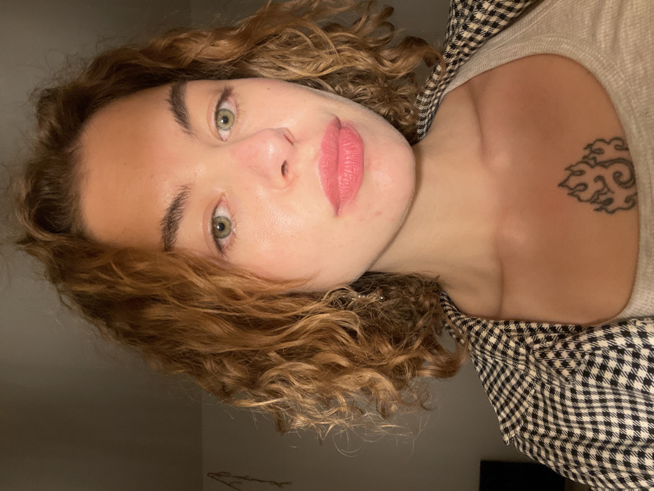 The image features a close-up of a young adult female, located in Boreti, Montenegro. She has shoulder-length, curly, reddish-brown hair and green eyes. Her skin appears fair, and her lips are tinted with a pinkish color. She is wearing a light-colored top, over which a black and white checkered jacket or shirt is visible. A tattoo depicting stylized flames is present on her upper sternum. A small, light-colored object, possibly an earring, is visible on her right earlobe. The individual is looking directly forward towards the camera. The background is dark, out of focus, and indistinct, indicating an indoor setting illuminated by artificial light from the front. A faint, thin, dark object, possibly a wire or decorative element, is discernible in the upper left background.