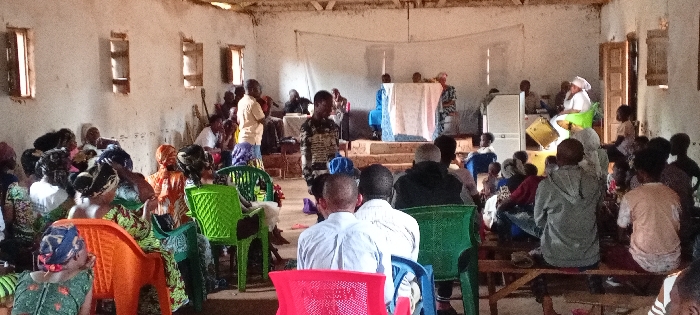 This image captures an indoor community gathering in Konongo, Democratic Republic of the Congo