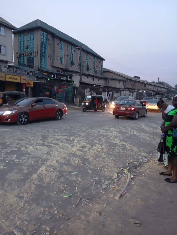 A street scene shows a reddish-brown car and other vehicles, including a three-wheeled auto-rickshaw, navigating a roadway. Pedestrians are visible to the right. The buildings lining the street include shops and businesses, one identified as "SPINACHI" and another as "DHL." The street surface appears uneven, with scattered debris. The sky suggests it's either early morning or late afternoon.